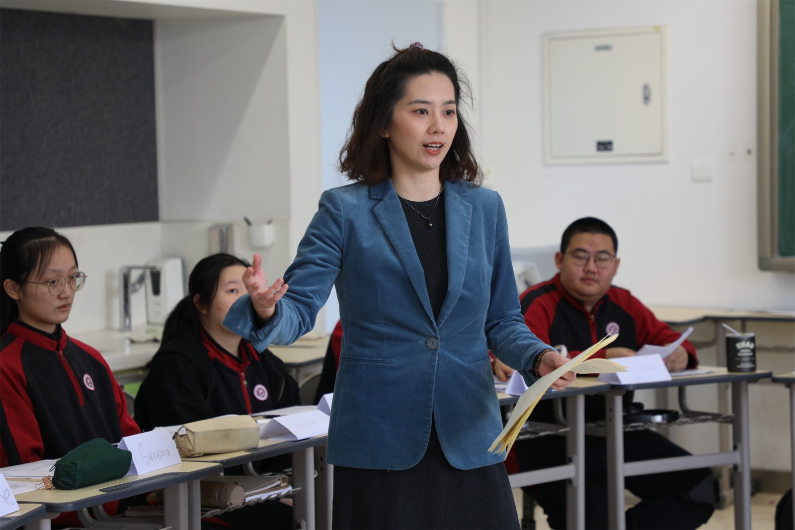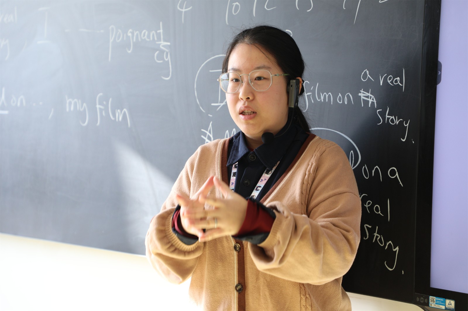 在英語文學(xué)課上,Galen老師帶領(lǐng)學(xué)生們討論了作家羅爾德·達爾(Roald Dahl)的短篇小說《待宰的羔羊》(Lamb to the Slaughter)。學(xué)生們討論了這個故事的哪個方面具有諷刺意味,以及它是哪種類型的諷刺。在課堂上的詞匯猜謎游戲中學(xué)生們競相描述和猜測單詞,氣氛十分熱烈。