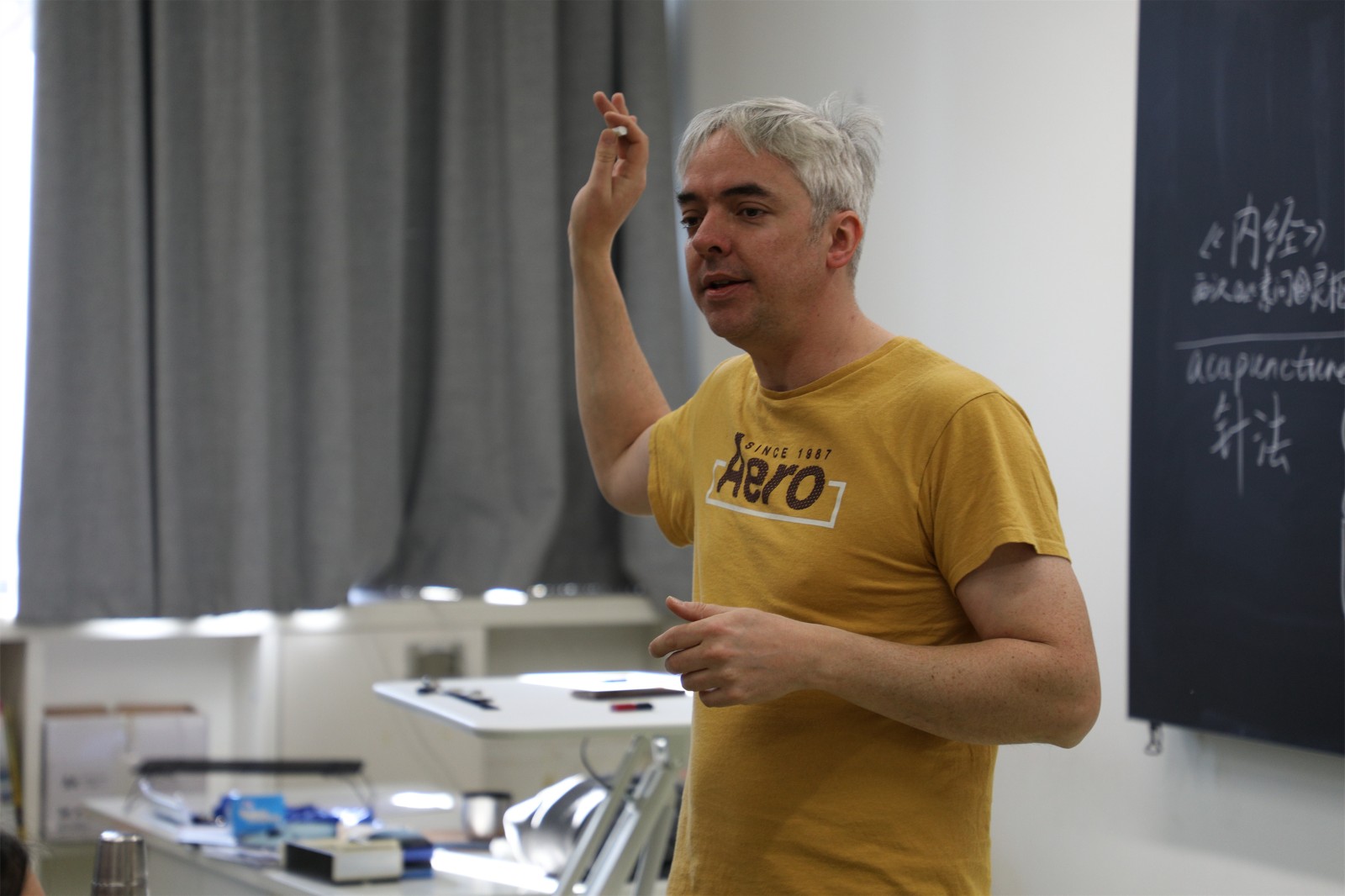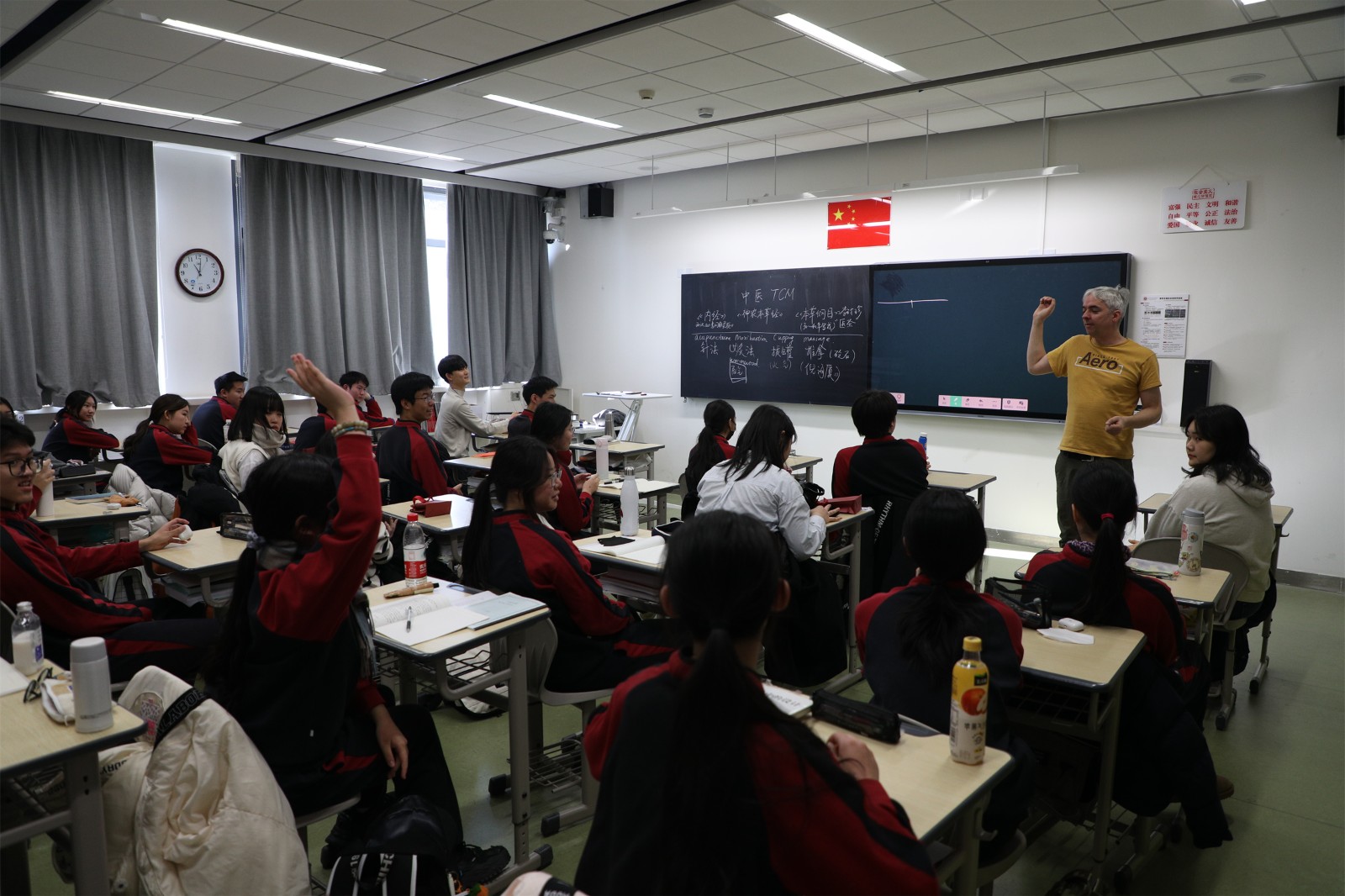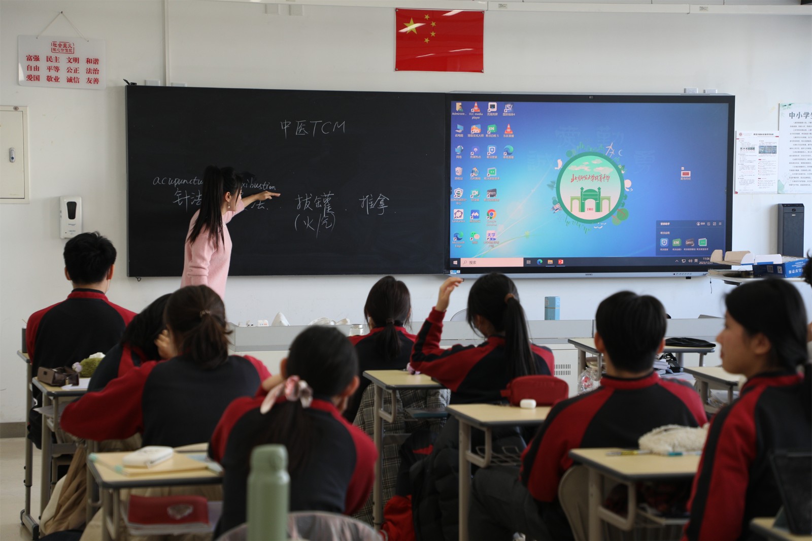 在李夢老師的中國傳統(tǒng)文化課上,老師介紹了中醫(yī)的基礎(chǔ)書籍《黃帝內(nèi)經(jīng)》,以及中醫(yī)常見的治療方法針刺、艾灸、拔罐、推拿,并給學(xué)生們展示了針灸療法不同型號的大中小針、艾灸常見的艾條和艾柱、真空氣罐的使用方法,還讓學(xué)生體驗了測量中草藥使用的小銅秤。李夢老師還邀請班里來自中醫(yī)世家的劉叢涵同學(xué)為大家做了中醫(yī)知識科普。劉叢涵同學(xué)不僅介紹了《黃帝內(nèi)經(jīng)》的由來和針灸療法的原理,還分享了自己腹瀉不止時通過按壓“天樞”穴位(肚臍眼左側(cè)兩指)迅速止瀉的親身經(jīng)歷。一位韓國男生體驗了半節(jié)課的無煙隨身艾灸盒,課后高興地告訴大家:“真的好舒服,冬天肚子上暖暖的!中醫(yī)真神奇!”一起聽課的韓國老師課后也向老師請教《黃帝內(nèi)經(jīng)》的入門書籍。