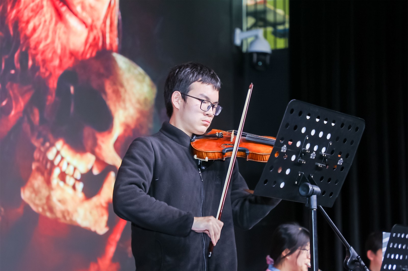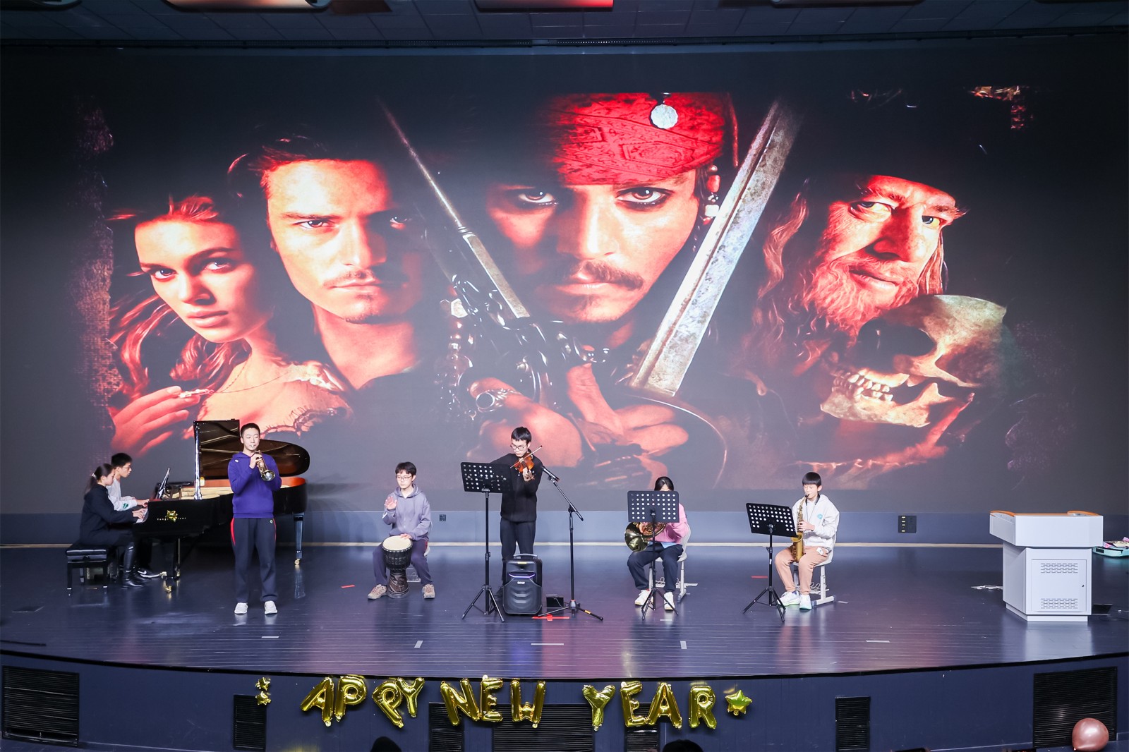 緊隨其后的是AP學(xué)子們合作演奏的一首樂曲《He’s a Pirate》。曲調(diào)恢弘,氣勢(shì)磅礴。鋼琴、圓號(hào)、小提琴等樂器相互交織、融合,向我們展現(xiàn)音樂的無限魅力,呈現(xiàn)了一首自由之歌。
